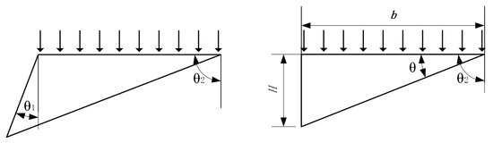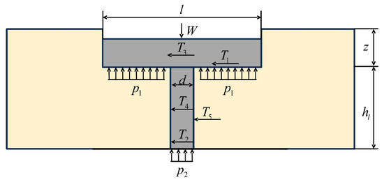 Taking the straight-line grouser configuration as an example, as the track shoe advances forward, the sandy soil undergoes displacement due to grouser-induced compression. Based on Rankine’s earth pressure theory, the soil in this region is assumed to be in a Rankine passive earth pressure state. The soil is subjected to a uniformly distributed load from the track shoe base. The vertical stress acting on a soil element at depth is calculated by directly superimposing onto the vertical principal stress of the soil element, as illustrated in Figure 6.
