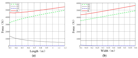 Impact of track structural parameters on soil thrust: (a) soil thrust vs. length; (b) soil thrust vs. width.