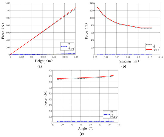 By substituting sandy soil and track structural parameters into the soil thrust formula, the influence of track structural parameters (L, b) on F1, F2, F3, and H is analyzed in Figure 7. As can be seen from Figure 7a, F1 and H increase with track length (L), while F2 decreases, and F3 remains unaffected. As can be seen from Figure 7b, F1, F2, and H increase with track width (b), whereas F3 decreases. Track structural parameters (L, b) exhibit a more pronounced impact on F1. The effects of grouser structural parameters (h, l, α) on F2 and F3 are shown in Figure 8. As can be seen from Figure 8a, both F2 and F3 increase with grouser height (h), with F2 showing significant enhancement. As can be seen from Figure 8b, F2 decreases with grouser spacing (l), while F3 remains unaffected. As can be seen from Figure 8c, F2 increases with V-shaped angle (α), whereas F3 shows no dependency.