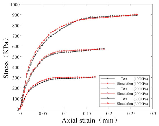 Firstly, the contact parameters were constrained within a narrow range through angle of repose tests and corresponding simulations. Subsequently, triaxial compression tests with confining pressures set at 100 kPa, 200 kPa, and 300 kPa were conducted alongside corresponding simulations. The parameters derived from the angle of repose tests were implemented in the simulations, and the resulting stress–strain curves were systematically compared with experimental triaxial compression data, as shown in Figure 9. This methodology enabled the acquisition of high-precision sand soil contact parameters. Furthermore, sliding plate tests and corresponding simulations were performed to obtain accurate contact parameters between the sand soil and track, with the finalized parameters summarized in Table 1.