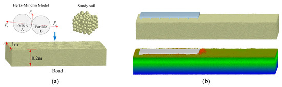 Based on the calibrated sand soil parameters, a sand soil bin was established in the discrete element software EDEM 2020. The sand soil was modeled using spherical particles, with interparticle interactions governed by the Hertz–Mindlin (no slip) contact model, which explicitly excludes cohesive forces between particles. Particle packing generated the soil bin model, measuring 2.5 m (length) × 1 m (width) × 0.2 m (height), as illustrated in Figure 10a.