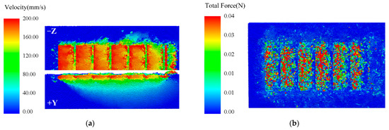 Sand soil particle contour map: (a) sand soil particle velocity contour map; (b) sand soil particle force contour map.