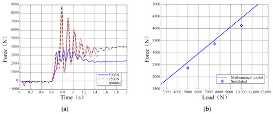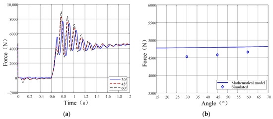 Comparative analyses between simulation and numerical results were conducted for each experimental group, as graphically presented in Figure 12, Figure 13, Figure 14 and Figure 15. Subplots (a) in Figure 12, Figure 13, Figure 14 and Figure 15 present the simulated temporal evolution of track shoe soil thrust. During the 0 s to 0.6 s phase, a transient force equilibrium between the track shoe and sand soil occurs under self-weight and inertial effects, during which no forward velocity is applied to the track shoe. The 0.6 s to 0.7 s interval exhibits velocity acceleration from 0 m/s to 0.2 m/s. From 0.7 s to 1.4 s, kinematic interaction between the track shoe and sand soil induces dynamic fluctuations in soil thrust. Beyond 1.4 s, the soil thrust demonstrates progressive convergence toward steady-state values. Subplots (b) in Figure 12, Figure 13, Figure 14 and Figure 15 display the numerical results of track shoe soil thrust (solid lines) alongside simulation outputs (diamond markers) under varying conditions. As shown in Figure 12, soil thrust exhibits a positive correlation with vertical load magnitude. The simulation results demonstrate strong agreement with the numerical model, thereby validating the efficacy of DEM. Figure 13 reveals that grouser height exerts a pronounced influence on soil thrust, with thrust values increasing with grouser height. Conversely, Figure 14 indicates a marginal inverse relationship between grouser spacing and soil thrust. Figure 15 illustrates that soil thrust moderately escalates with increasing V-shaped angles.