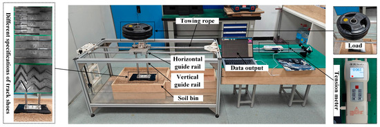 The soil bin test method demonstrates superior control over environmental conditions, offering advantages including reduced temporal and economic costs, shortened testing cycles, and high measurement accuracy. As illustrated in Figure 16, the testing apparatus comprises a horizontal rail, vertical rail, counterweight system, tension meter, data acquisition unit, and the soil bin. The tested track shoe is mounted at the base of the vertical rail, where the counterweight mechanism applies vertical loads. Horizontal tensile forces are continuously monitored and recorded via the tension meter’s real-time measurement capabilities.