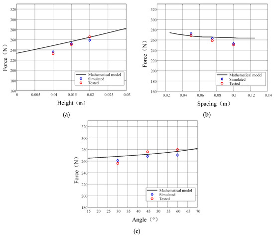 Comparative analyses among experimental measurements (circular markers), simulation outputs (diamond markers), and numerical results (solid lines) are graphically presented in Figure 17. Subplots a–c depict the effects of grouser height, spacing, and V-shaped angle on soil thrust, respectively. As evidenced by the figures, soil thrust demonstrates a pronounced positive correlation with increasing grouser height, and its influence is significant. Conversely, an inverse relationship is observed between soil thrust and grouser spacing, though its impact is marginal. Similarly, while soil thrust exhibits a moderate escalation with larger V-shaped angles, the impact of this parameter is also marginal. The maximum error between simulation results and the numerical results was 4.73%, with a mean error (ME) of 4.05% and root mean square error (RMSE) of 11.14 N. For experimental results versus the numerical results, the maximum error reached 5.16%, the ME was 4.43%, and the RMSE measured 12.21 N. This conclusively validates both the predictive accuracy of the numerical computational model and the efficacy of the coupling simulation methodology.