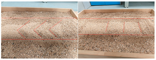 Figure 18 displays the track imprint patterns generated by the tracked vehicle’s movement on sandy soil. Observations indicate that regular sediment accumulation forms ahead of the grousers due to shear interaction between the grousers and sand soil. Shallower sand soil accumulation along the track flanks demonstrates that soil thrust on the grouser shear plane exceeds that on both the grouser sides and track edges, consistent with numerical model analysis. The consistency between coupling simulation results (velocity and force contour maps) and soil bin test observations validates the effectiveness of the coupling simulation methodology.