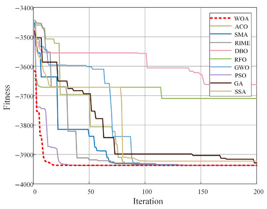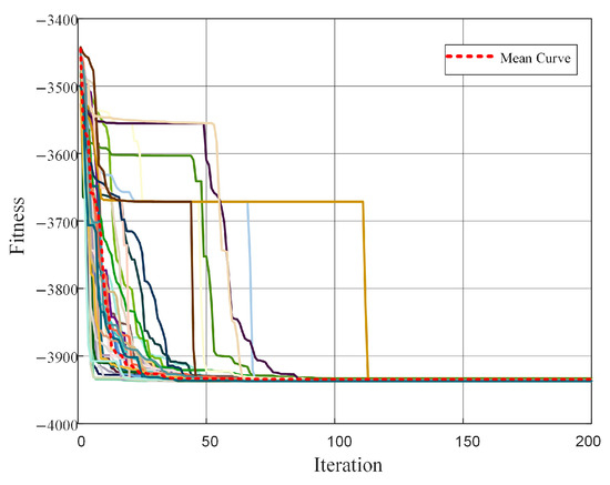 The WOA, a novel swarm intelligence optimization algorithm inspired by the foraging behaviors of whales, achieves optimal solutions through theoretical models encompassing search, encirclement, and hunting mechanisms. This algorithm exhibits significant advantages for engineering optimization problems, demonstrating high optimization accuracy and rapid convergence, while requiring no complex parameter tuning [32,33,34,35,36]. For the optimization of structural parameters in this study, the WOA was compared with nine other widely-used optimization algorithms: ACO, SMA, RIME, DBO, RFO, GWO, PSO, GA, and SSA. As illustrated in Figure 19, the results demonstrate that for this specific optimization problem, WOA demonstrates superior convergence characteristics and optimization accuracy compared to the other algorithms. Additionally, the convergence curves after 50 independent trials of the WOA are illustrated in Figure 20, where the red dashed line represents the mean curve and the remaining curves depict the convergence trajectories of each independent trial. The mean fitness value was calculated as 3937.32809 N, with a standard deviation of 0.90624 N, indicating that WOA exhibits high stability and robustness in optimizing the structural parameters of tracks and grousers.