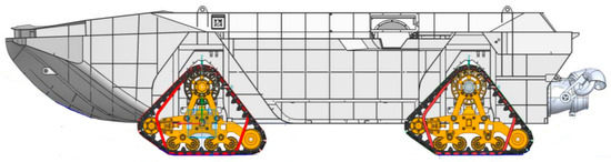Large-scale equipment operating on islands requires substantial fuel supply, which is transported through pipelines. The UATV can directly tow pipelines from offshore supply vessels to designated terrestrial locations. The UATV sequentially traverses marine zones, water–sediment mixed terrains, and beach areas, achieving fully automated operation with enhanced safety and efficiency. The vehicle’s configuration is illustrated in Figure 1. The vehicle is equipped with four segmented tracks, each independently driven by an electric motor. The tractive performance on beach is a critical metric for evaluating the UATV’s capabilities. This performance depends not only on the engine’s output power and transmission efficiency but also on the soil thrust generated through the soil–track interaction. In track design, structural parameters such as track length, width, grouser height, spacing, and V-shaped angle significantly influence soil thrust, making rational structural design of the track system essential. Current research predominantly focuses on stress analysis, wear failure mechanisms, and material optimization of track components, while research on systematic optimization of these parameters remains scarce. However, such optimization holds substantial theoretical and practical value for improving the tractive performance of tracked vehicles on soft soil.