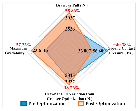 The driving performance comparison between the original and optimized tracks under straight-line motion is shown in Figure 22. Key metrics include a reduction of 40.38% in ground contact pressure, a 55.86% increase in drawbar pull, an 18.76% drawbar pull improvement from grouser optimization, and a 57.33% enhancement in maximum gradability. The optimized track configuration ensures sufficient tractive performance and climbing capability, while reduced ground pressure mitigates sinkage risks, enabling adaptability to complex terrains.