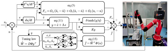 As a fundamental method of active compliance control, impedance control can dynamically adjust the interactive responses between a robot and a workpiece. When processing complex surfaces, impedance control effectively mitigates the process failures caused by errors in robot trajectory tracking [3,4]. Such process failures may include wear accumulation and surface burns on the workpiece. The existing impedance control methods encompass backstepping control [5,6], adaptive control [7], H-∞ control [8,9], etc. Based on traditional position impedance control, an earlier study [10] constructed an impedance controller based on environmental parameter identification by introducing the recursive least squares method with a forgetting factor to update environmental stiffness in real time online and correct the reference position to reduce the force tracking error. Another study [11] proposed a variable impedance control method for a continuous medium manipulator based on a finite-time observer. By identifying acceleration, it avoided the difficulty of directly sensing interference force and showed good robustness and stability in a noisy environment. A different study [12] investigated an adaptive tracking impedance control strategy for manipulators working within an uncertain contact environment. The proposed position and attitude controllers can ensure the finite-time convergence of state variables and do not require prior knowledge of the disturbance’s boundary. Furthermore, another group [13] proposed a whole-body impedance control method for a humanoid, wheeled robot that uses a fuzzy adaptive system to compensate for the uncertain dynamics of the controlled system. Moreover, a recent study [14] addressed the problem of stability being ignored in the design of variable impedance controllers for existing aerospace manipulators by implementing a variable impedance control system with state-independent stability to ensure the exponential stability of the desired variable impedance dynamic system. Impedance controllers based on mechanism models depend on accurate dynamic information regarding the robot. However, in grinding operations, factors such as friction force during tool–workpiece contact and the load change caused by material removal during grinding will cause the model to deviate from the real system.
