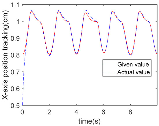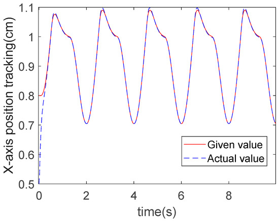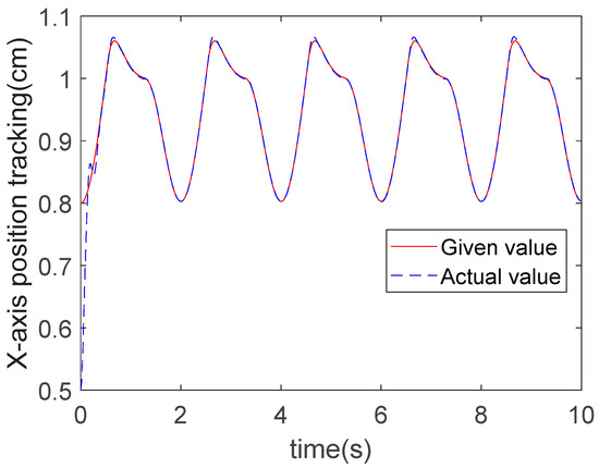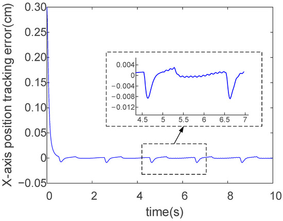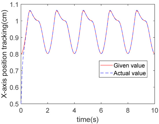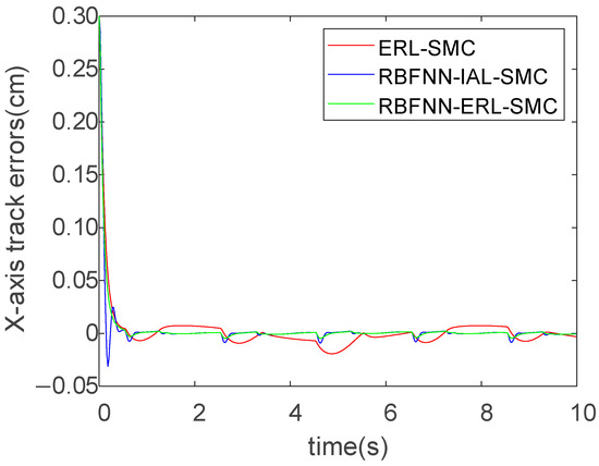 The X-direction trajectory tracking results of the three algorithms for a circular trajectory are presented in Figure 9, Figure 10 and Figure 11. It can be observed from these figures that under the action of the controllers, the motion of the robot end-effector in the X-direction reached a steady state and successfully achieved accurate tracking of the given values. Specifically, the convergence time of ERL-SMC is 0.6 s, that of RBFNN-IAL-SMC is 0.45 s, and that of RBFNN-ERL-SMC is 0.4 s. The tracking errors for all three methods are shown in Figure 12, revealing an absolute error amplitude of 0.02 cm for the ERL-SMC method, 0.01 cm for RBFNN-IAL-SMC, and 0.005 cm for the proposed RBFNN-ERL-SMC. The comparative analysis of the control performance difference between these two methods in the X-direction is presented in Table 4.