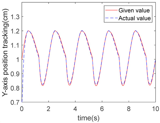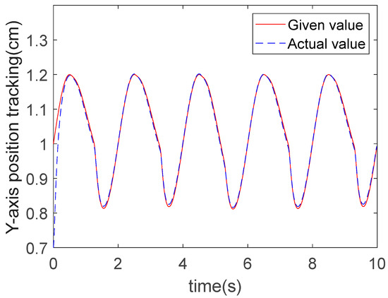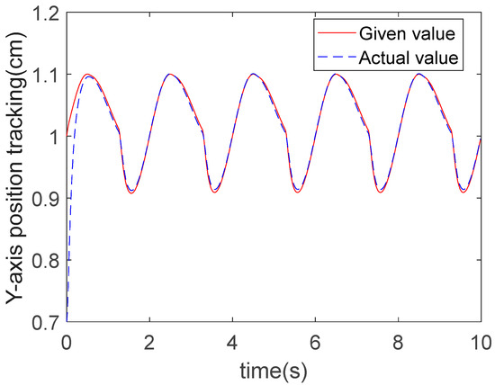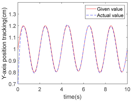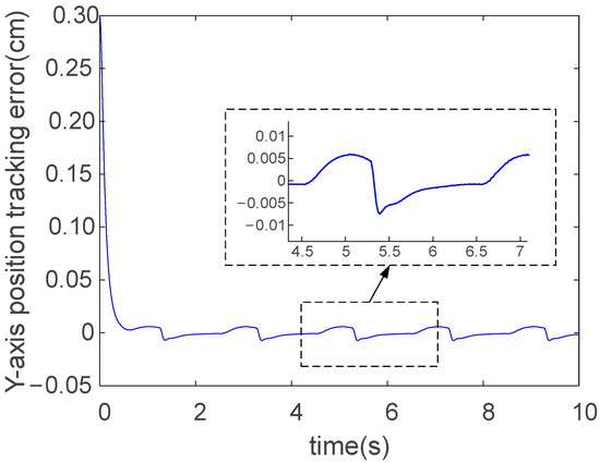 The tracking performance of the proposed method for the elliptic reference trajectory in the X-direction is shown in Figure 3 and Figure 4, while its performance in the Y-direction under the same trajectory is shown in Figure 5 and Figure 6. For the X-direction, the initial value of the robot’s actual end-effector trajectory is set at 0.5 cm, while the desired impedance trajectory initiates at 0.8 cm, specifically to preclude a performance validation compromise that could arise from identical starting conditions. Figure 3 demonstrates that the actual trajectory achieves exact tracking of the desired impedance trajectory in the X-direction at t = 0.5 s using the proposed control method. As demonstrated in Figure 4, the steady-state tracking error in the X-direction is maintained below 0.0092 cm during all the stabilization phases post t = 0.5 s. As shown in Figure 4, periodic oscillations occurred in the actual trajectory at t = 5 s. This phenomenon was caused by the external disturbance applied to the robot, where the disturbance signal took the form of a sawtooth wave function. Under the controller’s action, the robot is still able to remain stable during operation. Building upon the preceding tracking performance analysis, Figure 5 demonstrates accelerated convergence in the Y-direction using the proposed controller, achieving precise trajectory alignment at t = 0.6 s. Figure 6 confirms sustained steady-state tracking precision with errors constrained below 0.0075 cm, validating the robust disturbance rejection capabilities.