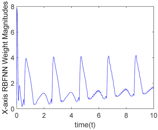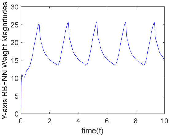 In the proposed method of this paper, the RBFNN is employed for online disturbance estimation and real-time compensation, thereby reducing the control scheme’s dependence on the model parameters. Figure 7 and Figure 8 display the sums of the nine weight magnitudes in the X-direction network and the Y-direction network, respectively. As observed from these figures, the weights reach steady-state values around t = 0.5 s, indicating that the RBFNN has achieved convergence in disturbance estimation. This is consistent with the tracking performance of the robot’s end-effector trajectory.