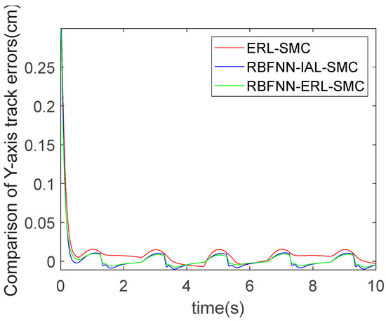 The results from the three algorithms in terms of Y-direction trajectory tracking are shown in Figure 13, Figure 14 and Figure 15. It can be observed from the figures that under the action of the controllers, the motion of the robot end-effector in the Y-direction reached a steady state and successfully achieved accurate tracking of the given values. Specifically, the convergence time of ERL-SMC was 0.5 s, that of RBFNN-IAL-SMC was 0.4 s, and that of RBFNN-ERL-SMC was 0.4 s. These results demonstrate that the implementation of the RBFNN significantly enhances the convergence speed. The tracking errors for all three methods are shown in Figure 16, revealing an absolute error amplitude of 0.015 cm for the ERL-SMC method, 0.011 cm for RBFNN-IAL-SMC, and 0.008 cm for the proposed RBFNN-ERL-SMC. The comparative analysis of the control performance difference between these two methods in the Y-direction is presented in Table 4.