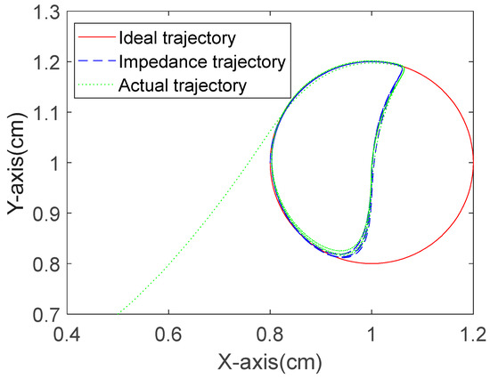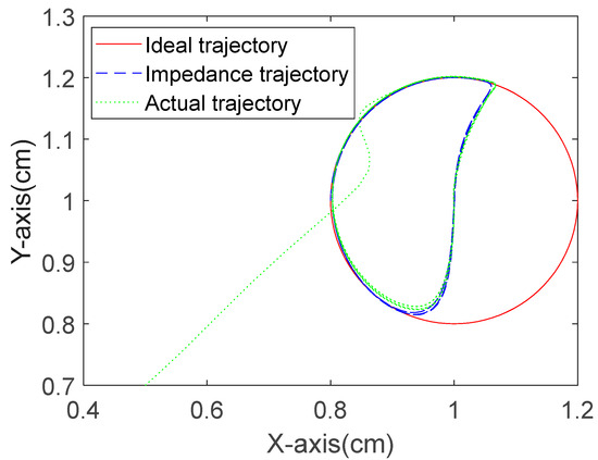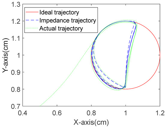 The tracking performances of the ideal trajectory, impedance trajectory, and actual trajectory of the robot end-effector in Cartesian space for the three algorithms are shown in Figure 17, Figure 18 and Figure 19. Using the proposed RBFNN-ERL-SMC method, the actual trajectory exhibits significantly smaller fluctuations compared to the other two simulations, with more concentrated trajectory paths and a superior performance.