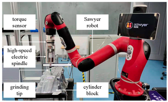 This section further examines the performance of the designed impedance control method through experimental verification and analysis. Figure 20 shows the grinding robot experimental system, which includes a Sawyer robot, a torque sensor, a high-speed electric spindle, a grinding head, and an engine block. This experiment compared the ERL-SMC and RBFNN-ERL-SMC controllers. Under the action of the controllers, all the joints achieved stable operation.