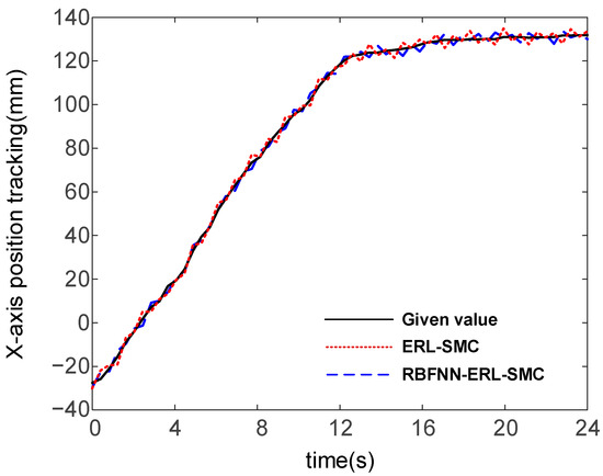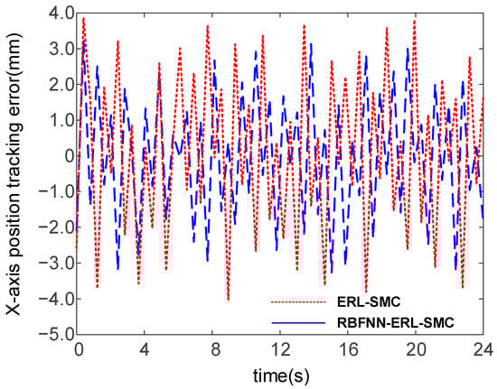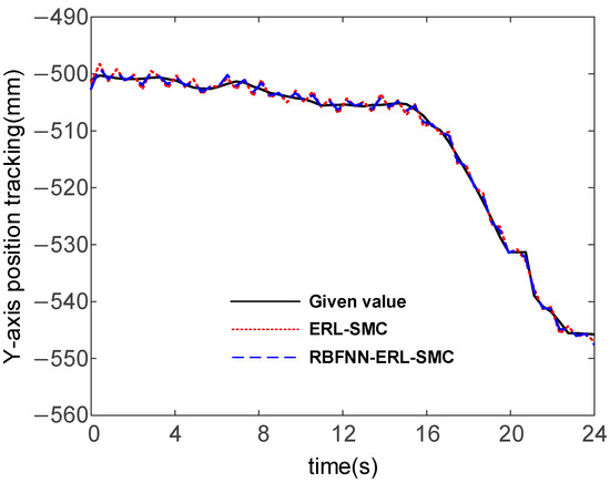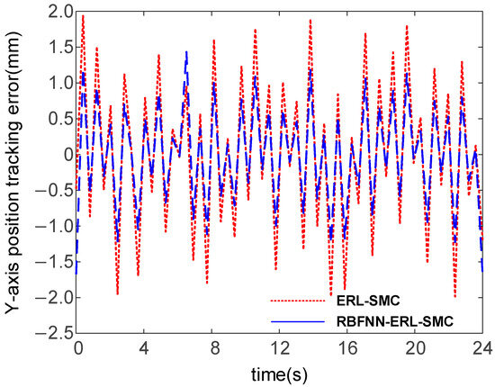 The results for trajectory tracking in the X- and Y-directions by the two algorithms are shown in Figure 21, Figure 22, Figure 23, and Figure 24, respectively. Under the action of the controllers, the motion of the robot end-effector in the X-direction reached a steady state and achieved accurate tracking of the given values. From Figure 21, position tracking by ERL-SMC fluctuated from −30.18 mm to 133.54 mm in the X-direction, while with RBFNN-ERL-SMC it ranged from −29.69 mm to 129.98 mm. From Figure 23, in the Y-direction, ERL-SMC fluctuated from −547 mm to −501.5 mm, while with RBFNN-ERL-SMC, the fluctuation ranged from −547.5 mm to −502.7 mm. Critically, Figure 22 reveals that the steady-state error magnitude in the X-direction was reduced from 4.03 mm with ERL-SMC to 3.27 mm using RBFNN-ERL-SMC. Similarly, Figure 24 demonstrates Y-direction error reduction from 1.96 mm to 1.67 mm through RBFNN-ERL-SMC enhancement. This indicates that the system exhibited smaller fluctuations and more precise tracking using the RBFNN-ERL-SMC method.