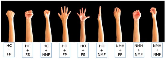 Nine different possible combinations of the movements of interest: hand-open (HO), hand-close (HC), no-movement hand (NMH), forearm pronation (FP) and forearm supination (FS), and no-movement forearm (NMF).