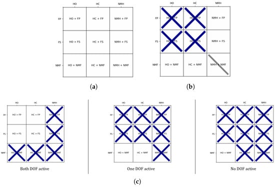 - For the sequential control, since the first signal has already ruled out some of the movements, the second signal operates within a selection matrix that varies from 2 × 2 to 1 × 1 (Figure 3c), which implicates three different scenarios with, 4, 2, and 1 possible options.
