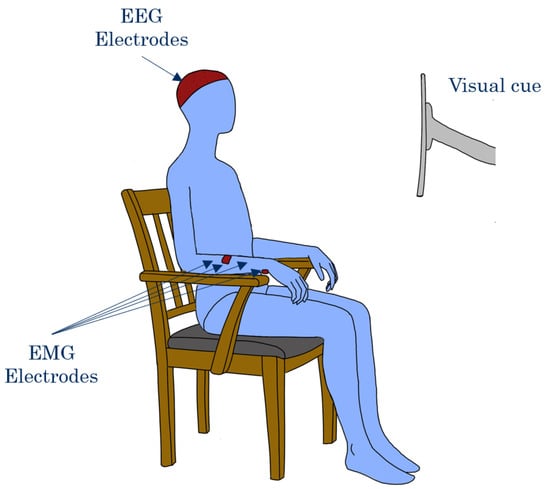 The experiment was conducted in a sound-proof, electrically shielded room to minimize environmental noise and electrical interference. Participants were seated comfortably in a chair facing a computer monitor that displayed visual cues. To ensure consistency and minimize muscle fatigue or artifacts related to postural maintenance, the participant’s dominant (right) arm was rested on the armrest with the elbow in a flexed position (90 degrees) and the forearm and wrist supported by the chair.