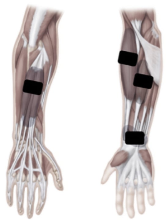 The EMG electrodes were placed over the extensor digitorium, flexor carpi radialis, pronator quadratus, and brachioradialis muscles.
