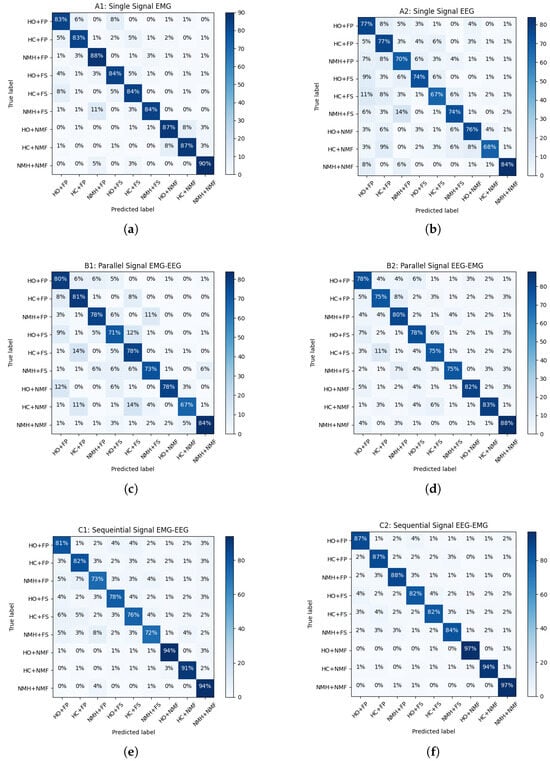 Confusion matrices for the classification results over the 9 classes. The vertical axis corresponds to the true labels of the movements, while the horizontal axis corresponds to the predicted labels from the classification algorithm. Each subfigure shows the performance of a specific control scheme: (a) A.1: Single-Signal EMG; (b) A.2: Single-Signal EEG; (c) B.1: Parallel EMG-EEG; (d) B.2: Parallel EEG-EMG; (e) C.1: Sequential EMG-EEG; and (f) C.2: Sequential EEG-EMG.
