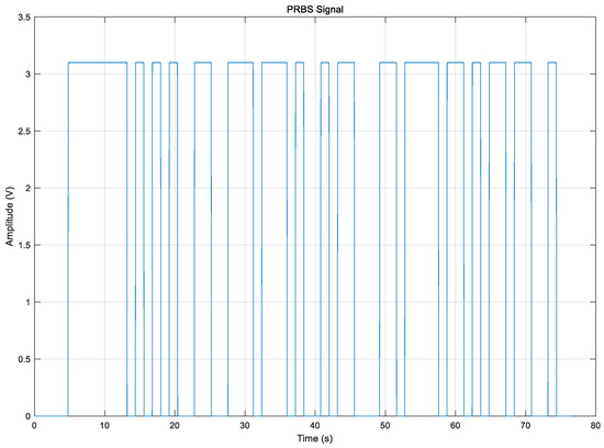 The dynamic characteristics of the BLDC motor were identified using a continuous-time transfer function derived from experimentally acquired input and output data. To evaluate the system’s response under a range of conditions, various excitation signals, including PRBS, sinusoidal, exponential, ramp, and chirp waveforms, were applied. Each excitation signal was evaluated based on its ability to generate a model that generalizes well across different operating conditions. Among them, the transfer function estimated using the PRBS signal demonstrated the highest accuracy and consistency in terms of generalization. Figure 2 shows the waveform of the PRBS signal used for identification.