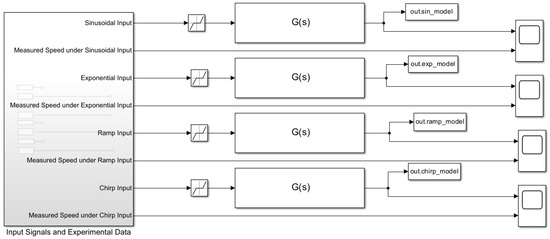 Moreover, to evaluate its generalization capability, the identified model was validated against experimental results obtained using other excitation signals, such as sinusoidal, exponential, ramp, and chirp signals. Figure 3 illustrates the MATLAB/Simulink model used for the validation of the identified BLDC motor model. In addition, a dead zone nonlinearity was incorporated into the BLDC motor model using the Dead Zone block in Simulink to account for the threshold input voltage below which the motor does not respond. This behavior reflects the real characteristics of the motor, which requires a minimum input of approximately 1.1412 volts to overcome internal friction and control delays. As shown in Figure 4, this improves the model’s accuracy, particularly in the low-input region.
