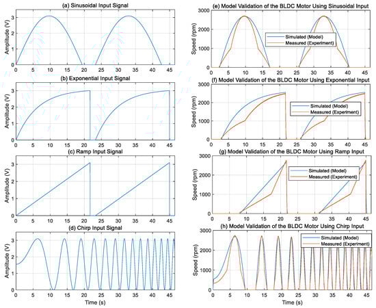 - Model Validation and Performance Analysis: The BLDC motor model was identified using input and output data obtained under PRBS excitation. To evaluate the model’s ability to generalize beyond the identification dataset, various independent test signals, such as sinusoidal, exponential, ramp, and chirp waveforms, were applied experimentally to the physical system and to the identified model in MATLAB Simulink. The simulated responses were then compared with the corresponding experimental results to qualitatively assess the accuracy of the model across a range of dynamic operating conditions.
