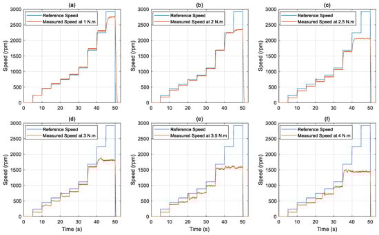 Reference and measured speed responses of the BLDC motor under fixed load torques: (a) 1 N·m, (b) 2 N·m, (c) 2.5 N·m, (d) 3 N·m, (e) 3.5 N·m, (f) 4 N·m.