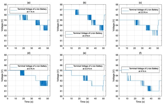 Terminal voltage of the Li-ion battery during BLDC motor operation under variable reference speed and fixed load torque conditions: (a) 1 N·m, (b) 2 N·m, (c) 2.5 N·m, (d) 3 N·m, (e) 3.5 N·m, (f) 4 N·m.