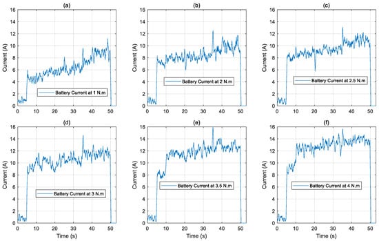 At the highest load torque of 4 N·m (Figure 7f), the battery current peaks at approximately 15 A, indicating the system’s maximum electrical load during the test sequence. The sharper current spikes and increased variability further suggest that the drive system is operating near its performance boundaries under this condition. These observations underscore the significant influence of mechanical load on current demand, which directly impacts system efficiency, battery heating, and overall energy management.