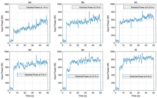 At higher torque levels of 3 N·m, 3.5 N·m, and 4 N·m (Figure 8d–f), the input power exceeds 850 W during the higher-speed segments, revealing a significant escalation in energy consumption. These operating points represent more strenuous loading conditions, where both the current demand and the back EMF effects increase, thereby amplifying the required input power. Minor fluctuations in the power signal are particularly evident during acceleration phases and are attributed to transient current surges as the motor responds to changes in speed and load.