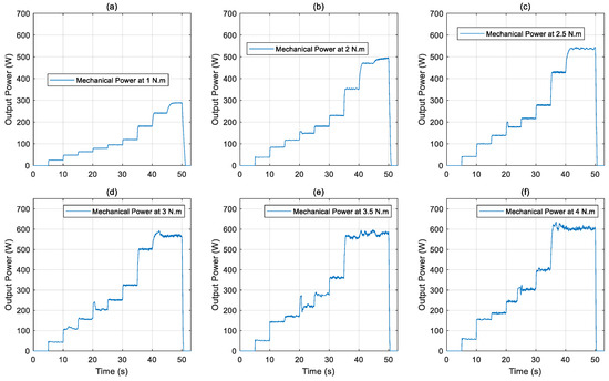 Mechanical output power of the BLDC motor under variable reference speed and fixed load torque conditions: (a) 1 N·m, (b) 2 N·m, (c) 2.5 N·m, (d) 3 N·m, (e) 3.5 N·m, (f) 4 N·m.