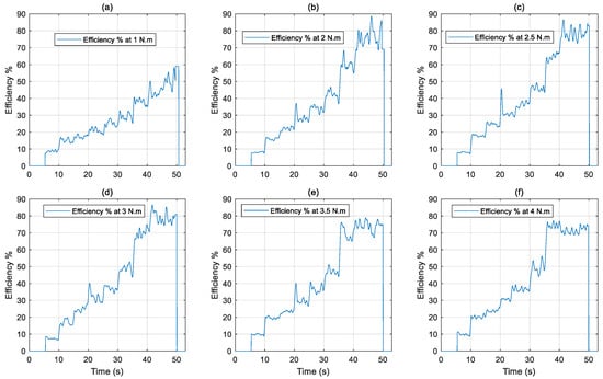 As the torque increases to 2 N·m and 2.5 N·m (Figure 10b,c), the efficiency improves significantly, reaching peak values of 86% and 83%, respectively. This enhancement reflects a more favorable load condition where the motor operates closer to its optimal efficiency region, with reduced relative losses and better utilization of the supplied electrical energy.