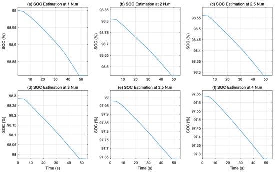 Figure 11 presents the estimated SOC of the Li-ion battery during variable-speed operation under six different fixed torque levels. These results provide valuable insight into how mechanical loading influences battery depletion dynamics over short operational intervals.