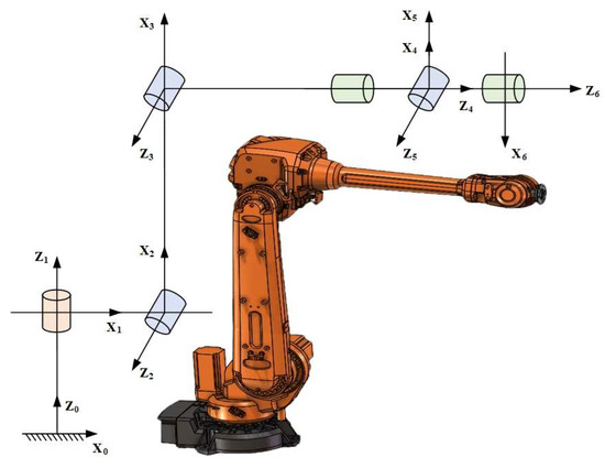 This paper focuses on the drilling and riveting system of the ABB IRB4600 industrial robot. ABB (ABB Asea Brown Boveri Ltd., Zurich, Switzerland), headquartered in Zurich, Switzerland, is a company specializing in the production of automation equipment. Based on the DH modeling method, the kinematic model of the ABB IRB4600 industrial robot is established for the research object of this study. Figure 1 and Table 1 show the kinematic model of the robot and its theoretical kinematic parameters, respectively.