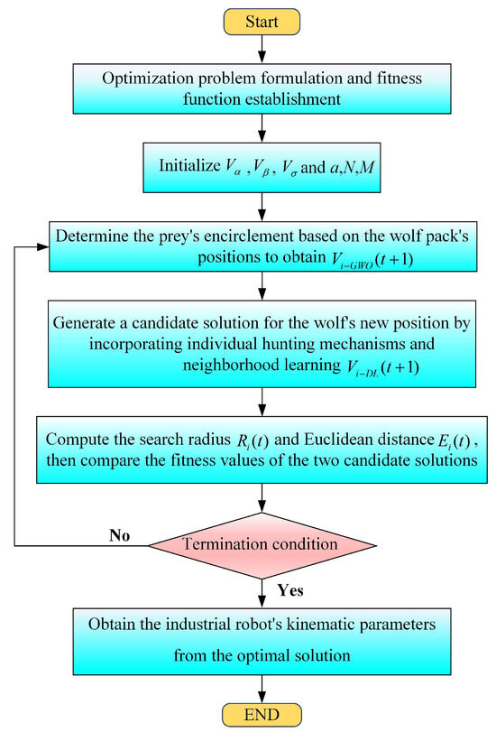 To address the issues of the GWO algorithm in industrial robot kinematic calibration, corresponding improvement strategies have been proposed. These improvements mainly involve new search strategies applied in three stages: initialization, movement, and selection–update.