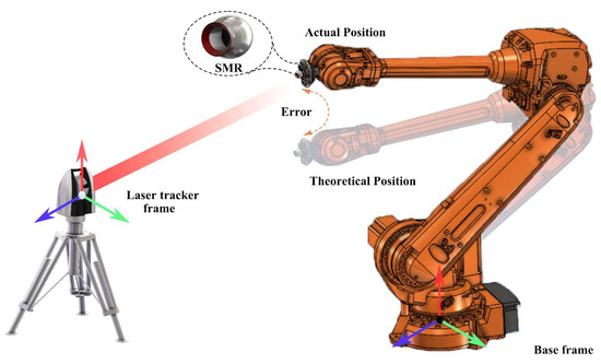According to the error model of industrial robots established in Section 2.2, the kinematic parameters to be calibrated can be obtained. The accuracy of these parameters can be verified by identifying them and performing error compensation. The theoretical position can be calculated by the robot kinematic model, while the actual position is measured by instruments. Figure 4 shows the theoretical model diagram of the calibration experiment.