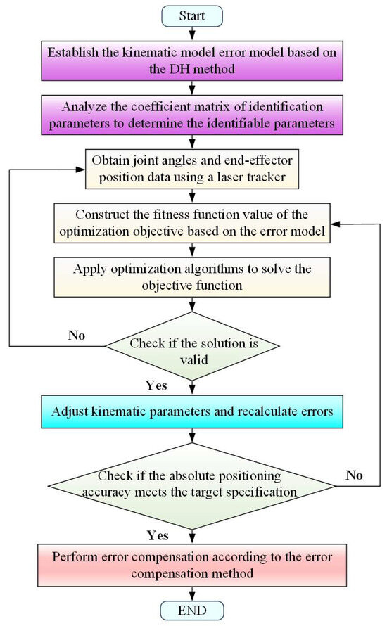 Over the past few decades, extensive research has been conducted on the kinematic parameter calibration of robots [13,14]. Jiang et al. [15] employed the extended Kalman filter and particle filter algorithms to identify the kinematic parameters of a Kawasaki RS10N robot, achieving an improvement in absolute positioning accuracy with the positioning error reduced from 3.1407 mm to 0.263 mm after calibration. Gao et al. [16] proposed a novel hybrid algorithm combining BP neural networks and Particle Swarm Optimization (PSO) for kinematic parameter identification, improving the positioning accuracy of the ER20-C10 robot to 0.4 mm after parameter error compensation. Luo et al. [17] developed a calibration method based on a hybrid algorithm of Levenberg–Marquardt (LM) and Differential Evolution (DE) to calculate kinematic parameter deviations, and comprehensive experiments on a FANUC M710ic/50 industrial robot showed that the method significantly enhanced the calibration accuracy of the robot arm.