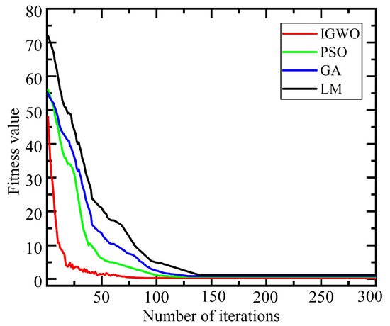 Figure 7 shows that the LM algorithm achieved the best fitness function value of 1.132 after 145 iterations. The GA and PSO algorithms obtained the best fitness function values of 0.847 and 0.685 after 134 and 126 iterations, respectively. In contrast, the IGWO algorithm obtained the best fitness function value of 0.452 after only 95 iterations. Compared with other optimization methods, the IGWO algorithm demonstrates faster convergence speed and superior fitness function values. Furthermore, due to the adoption of the DL search strategy, the IGWO algorithm can converge more rapidly in the initial stage, effectively reducing the calculation time of the algorithm.