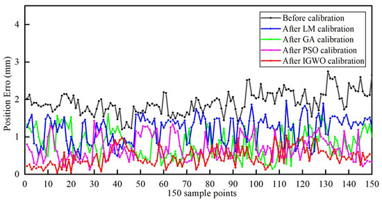 After obtaining four sets of different kinematic parameters for the industrial robot, error parameter compensation was performed, and the position error of each of the 150 initially collected sampling points was compared before and after compensation. Table 2 presents the kinematic parameters of the industrial robot calculated using the IGWO algorithm. Figure 8 illustrates the position error data of the robot before and after compensation using the four optimization algorithms.