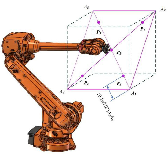 To validate the calibration effectiveness of this experiment at other positions within the robot’s workspace, the calibration results were verified in accordance with the industrial robot position accuracy detection method specified in GB/T 12642-2013 [34] “Industrial robots—Performance criteria and related test methods”. As illustrated in Figure 9, within the industrial robot controller, a cubic region most frequently utilized in robot applications was selected according to the robot performance verification protocol, and the positions of five test points were calculated. A program was then developed to instruct the robot to cycle 30 times in the sequence of P1 → P2 → P3 → P4 → P5, with a laser tracker employed to measure the actual positions of these points.