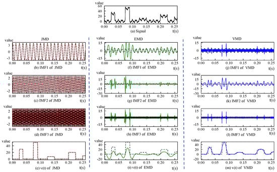 Then, three signal decomposition methods, JMD, EMD, and VMD, were employed to analyze these signals. The results obtained from both methods were compared to evaluate the effectiveness of the JMD. The five parameters used in the JMD are set as follows: , , , , and . The decomposition results of three methods are illustrated in Figure 1. Figure 1a illustrates the original complex signal . In all figures, the dashed black lines represent the original components of the signal, while the red, green, and blue solid lines correspond to the decomposition results obtained by JMD, EMD, and VMD, respectively. The components obtained using the JMD method are shown in Figure 1b–e. It can be observed that the JMD method can accurately separate three oscillatory components at different frequencies as well as one jump component from the original signal. The first three layers distinctly display oscillatory wave components at frequencies of 80, 200, and 500 Hz. The last layer contains the extracted jump components. In contrast, the waveforms of each layer decomposed by the EMD or VMD method are not ideal and fail to effectively separate the jump signal and oscillatory components, as illustrated in Figure 1f–m.