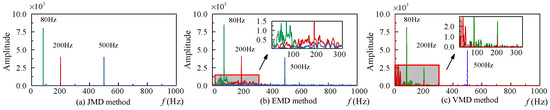 Comparison of the frequency spectrum of the oscillatory components obtained by JMD, EMD, and VMD decomposition.