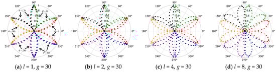 Effect of parameter l variation on SDP image, red, green, black, yellow, purple and blue represent petals of 0°, 60°, 120°, 180°, 240° and 300°, respectively.
