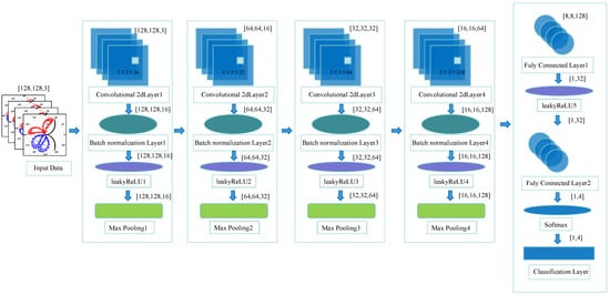 The entire ICNN framework adopted in this paper is illustrated in Figure 5, which comprises one image input layer, four batch normalization layers, four convolutional layers, four pooling layers, five activation functions, two fully connected layers, one SoftMax layer, and one classification layer. The size of the sample matrix for constructing the sample set is 128, so the dimension of the input data of the ICNN is 128 × 128 × 3, where 3 represents the RGB three-color channel. In this study, an activation function layer is incorporated between each convolutional layer and pooling layer, utilizing the LeakyReLU function. The output size of the fully connected layer is set to 4, indicating that four distinct signal types or labels are generated. Finally, the output was converted into a probability distribution through the SoftMax layer to complete the final classification. In this paper, MiniBatchSize is set to 32 to specify the number of samples included in each training batch, which helps to improve the utilization efficiency of the GPU. In addition, by setting MaxEpochs to 375 and InitialLearnRate to 0.001, the smaller step size makes the model more likely to stably converge to a local optimal solution or a global optimal solution during the optimization process.