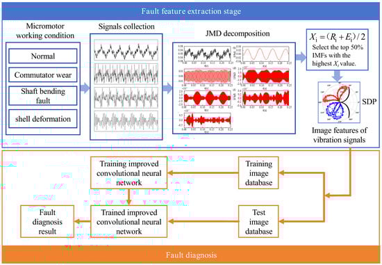 In this study, we combined the strengths of JMD and SDP for feature extraction, proposed a novel ICNN method to improve learning and recognition efficiency, and developed a fault diagnosis method for rotating machinery. First, the preprocessed signals are decomposed using the JMD decomposition method. The IMFs are subsequently identified as the feature extraction objects based on the correlation coefficient–energy criterion. Following this, the extracted IMFs were transformed into SDP images. Finally, the resulting images from the JMD-SDP process served as the input for the micro-motor fault diagnosis model, in which the ICNN method was employed for learning. Compared with some traditional combinations such as STFT-CNN and VMD-SVM, the proposed method achieves superior diagnostic accuracy and robustness for weak and non-stationary fault signals. While STFT-CNN methods are limited by the time–frequency resolution trade-off [19], and SVM-based classifiers are less effective for complex or nonlinear feature spaces [20], our approach leverages adaptive mode decomposition and deep learning to deliver more reliable and interpretable results.