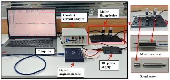 To verify the effectiveness of the proposed JMD-SDP-ICNN method, a micro-motor fault identification platform was constructed, as shown in Figure 7. The platform is mainly composed of the motor to be tested, DC power supply (DP100 numerical control power supply), sound sensor (CT1213 microphone with CT1201 amplifier, Shanghai Chengke Electronics of China), sensor adapter (CT5204 four-channel constant current adapter, Shanghai Chengke Electronics of China), signal acquisition card (PicoScope 2406 B, Pico Technology Company of UK), computer, and fixed platform. The sound sensor is capable of capturing frequencies in the range of 20 Hz to 20 kHz. The acquisition card has a bandwidth of 50 MHz and can achieve a maximum sampling rate of 1 GHz for a single active channel. The specific sample of the micro-motor used in this study was an 8520 hollow cup motor, and the detailed parameters are presented in Table 2. Throughout the experimental procedures, all motors and sound sensors were securely affixed to the fixed platform using an L-clamp.