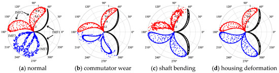 To accurately assess the occurrence of faults in the micro-motor and classify the specific fault types, this study employs three selected IMF layers as inputs for generating the SDP image. As described in Section 2.2, the parameters associated with the generation of the SDP image are determined as follows: and , where denotes the number of generated petals. Given that the input comprises three IMFs, is set to 3. Accordingly, the corresponding values for the three pairs of petals were 0, 120, and 240, respectively. Moreover, the angle amplification factor and the time interval coefficient are used to obtain non-overlapping modes. Figure 8 illustrates the SDP images for the normal motor and the three faulty motors. In these figures, the black, red, and blue petals represent IMF1, IMF2, and IMF3 components, respectively. Specifically, Figure 8a illustrates the normal condition, and Figure 8b–d correspond to commutator wear, shaft-bending fault, and housing deformation, respectively.